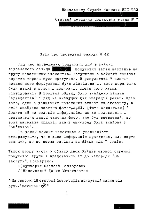 В архіві містився секретний рапорт начальнику служби безпеки НДІЧАЗ, який нам “точно” не можна було побачити. У самому звіті йшлося про сутичку загону НДІЧАЗ з невідомими незаконними особами. У ході сутички всіх ворогів було знищено, двох взяли в полон, і допитали. Один із допитаних полонених вказав на місцезнаходження схованки, в якому знаходилося загадкове фото. Також було вказано, що це зображення належало людині, яка в минулому була знайома з “Об’єктом”. Що коїться? Хто або що таке “Об’єкт”? Ми теж не розуміли…