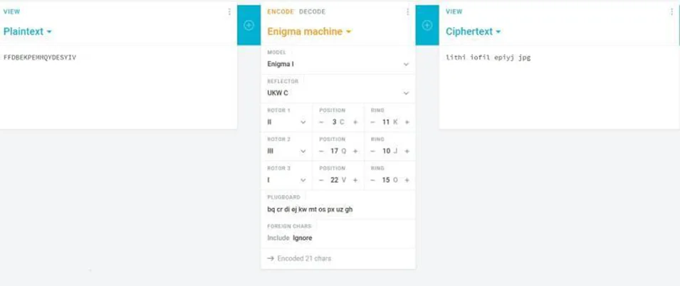 «Р — 2 3 1, Кольцо — Кило Джулиет Оскар, Позиция — Чарли Квебек Виктор, Отражатель — Чарли» , де Р — порядок роторів, Кольцо, Позиция и Отражатель – однойменні налаштування із введенням літер (радіоповідомлення мало кодування НАТО – літер англійської мови).