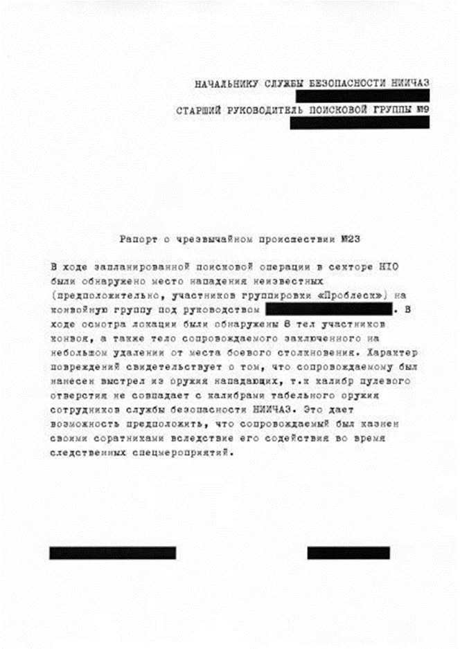 У першому документі згадувався наш старий знайомий журналіст Веніамін Алексєєнко. Інститут видав йому найменший рівень допуску, оскільки Веніамін знає про якийсь «Об’єкт», і тепер НДІЧАЗ хоче спостерігати за всіма його діями. Другий документ говорив про нові точки маршруту груп дослідників від інституту. Деякі з дешифраторів злили ці дані “Проблиску”. Ці дії призвели до загибелі агентів, про що нам пізніше повідомив Куратор. У цей же час починаються розбирання та активно шукається зрадник, який злив інформацію «Проблиску».