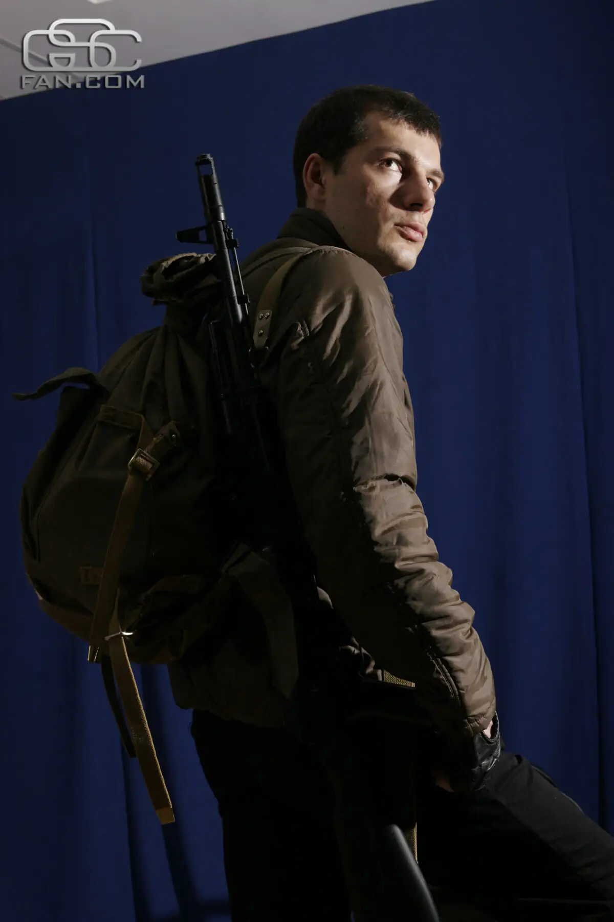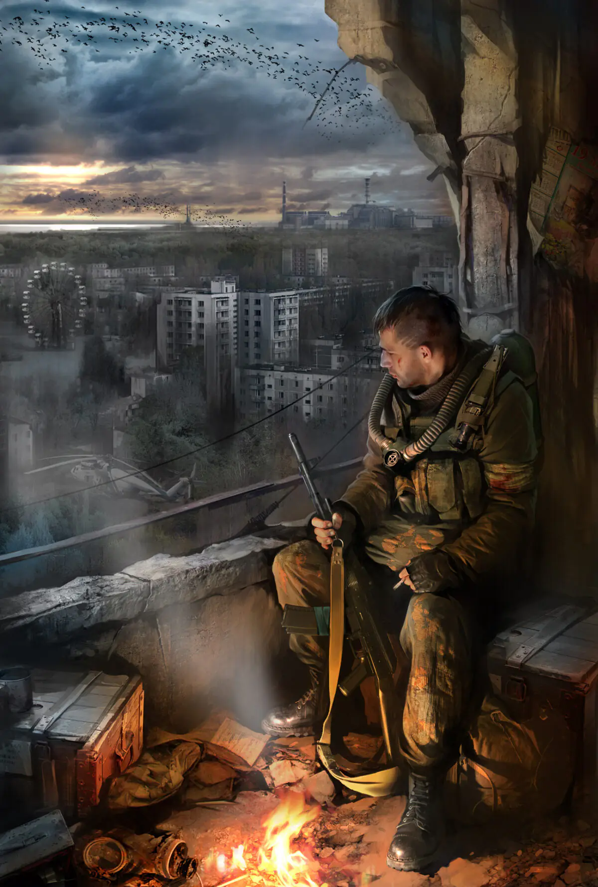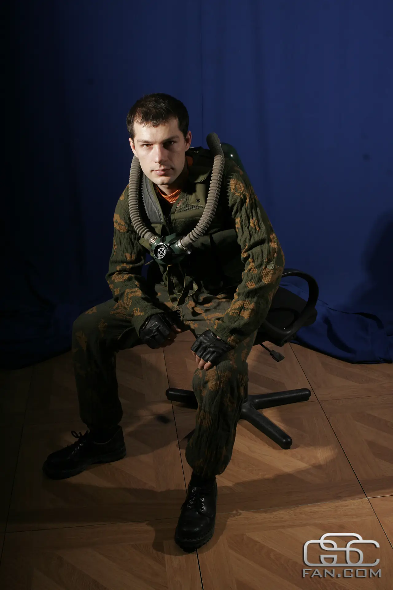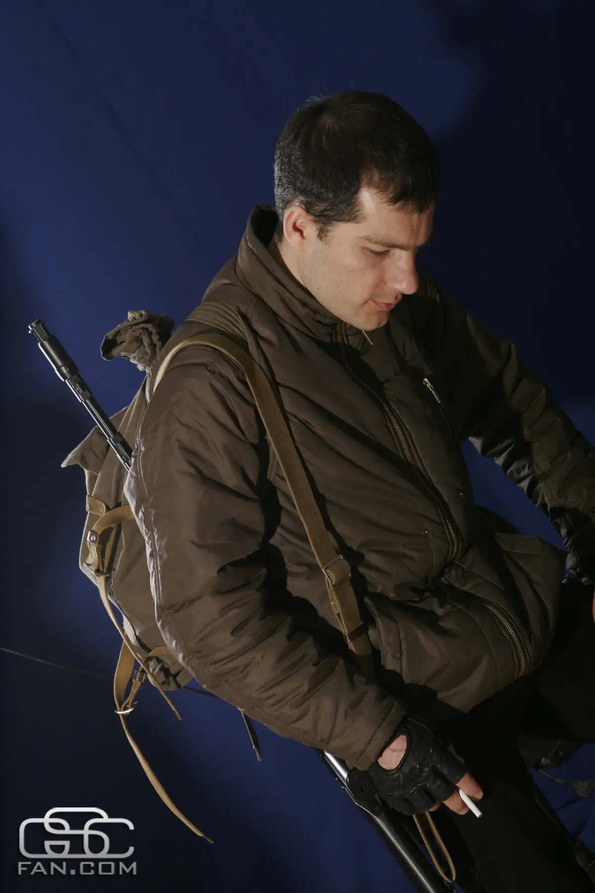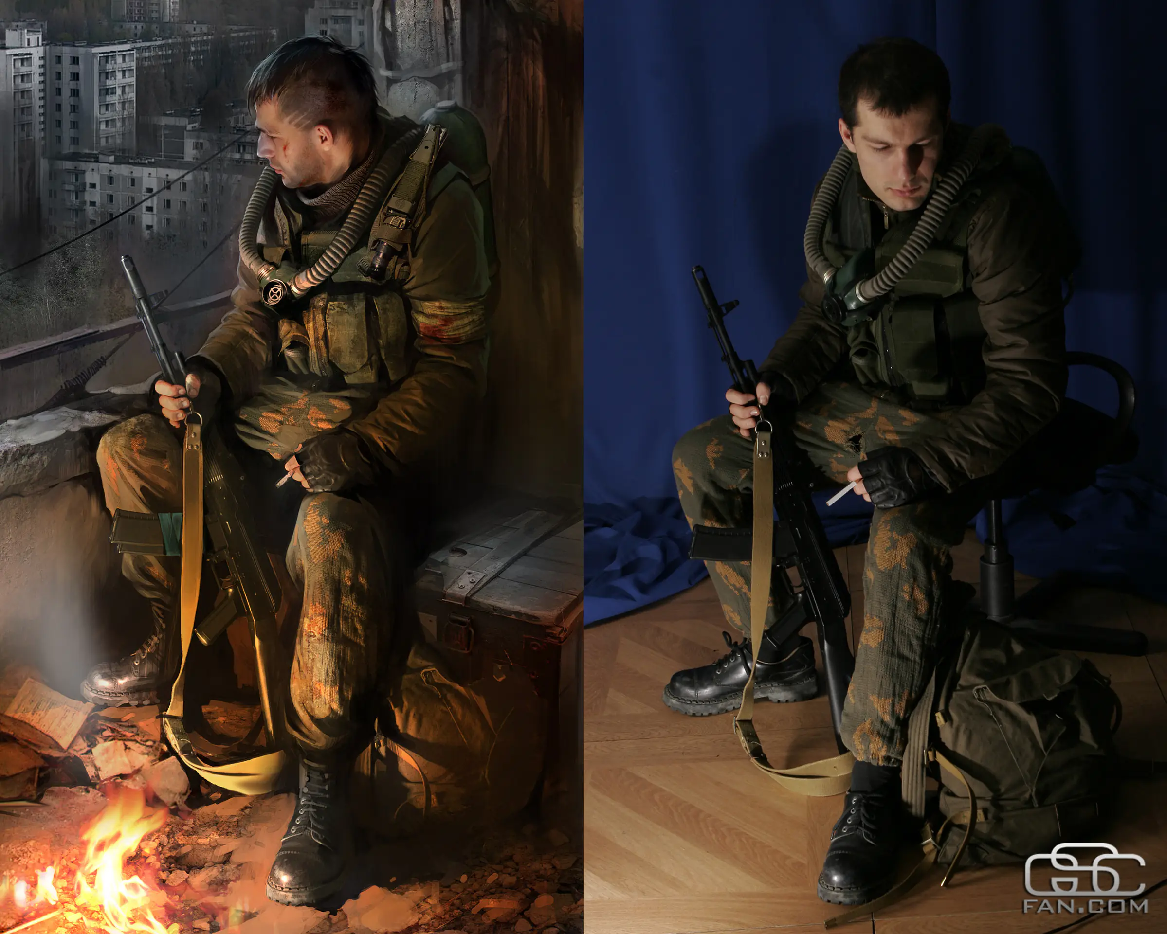 У чому ми тільки не фотографувалися — з автоматом, без автомата, з респіратором, у рюкзаку, без рюкзака. А потім мене ще й одягнули в камуфляж і змусили посидіти з цигаркою в задумливій позі (бракувало тільки героїчної музики) та з рюкзаком біля ніг (напевно, там мала бути купа радіоактивних артефактів) поруч з «багаттям» (цікавий факт: речі, використані Олександром для фотосесії, це страйкбольне спорядження Валентина Єлтишева, PR-менеджера GSC Game World — прим. ред.).