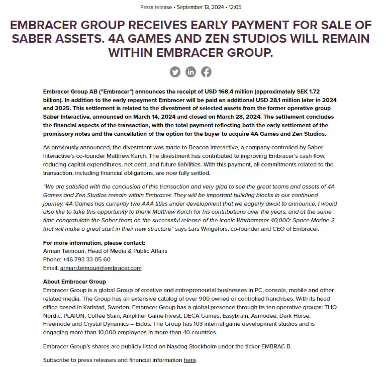 Embracer Group в прес-релізі 13 вересня оголосили, що 4A Games залишається в складі холдингу.