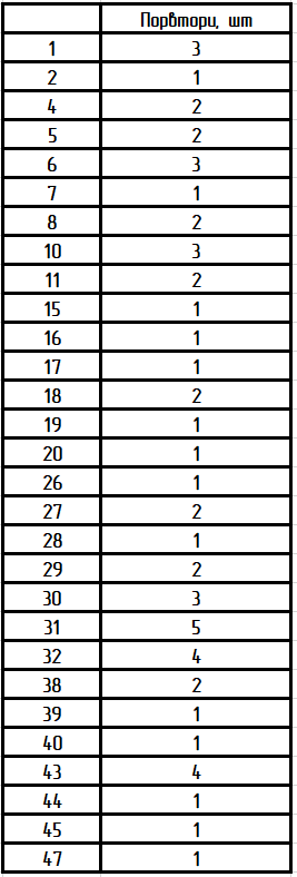 46×6, 6×3, 14×3, 5×2, 7×2, 8×2, 12×2, 22×2, 39×2, 1, 4, 10, 11, 15, 20, 21, 23, 24, 25, 27, 32, 33, 34, 38, 40, 41, 45, 47