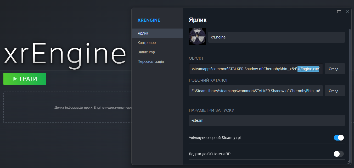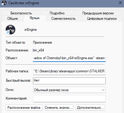 @kpln Створи ярлик xrEngine.exe (наприклад на робочому столі). У властивостях ярлика в полі Об'єкт, в самому кінці після двокрапки, натисни пробіл та напиши -steam.