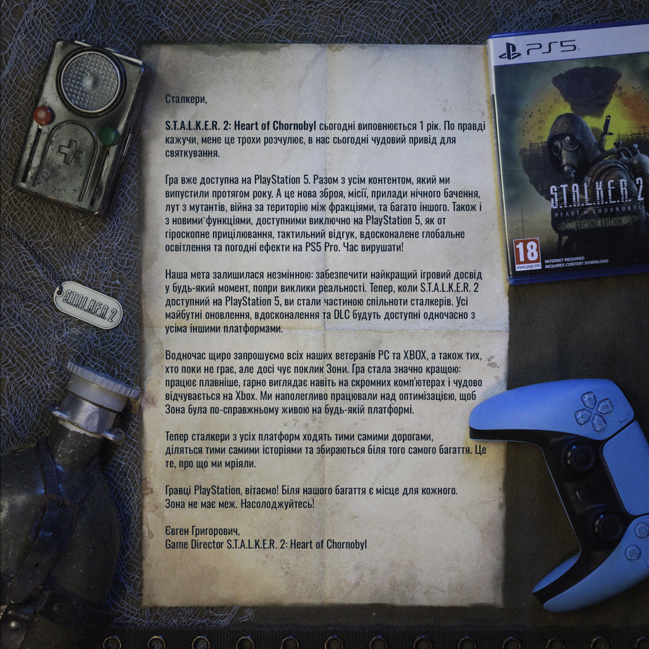 Сталкери, S.T.A.L.K.E.R. 2: Heart of Chornobyl вже робить перші кроки на PlayStation®5. Перед тим як побігти досліджувати консольну Зону, ми хочемо подякувати вам за незмінну підтримку.