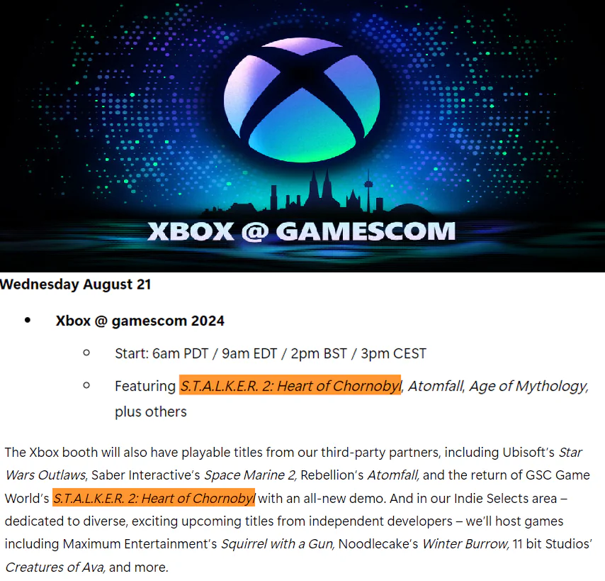 На ресурсі XBOX Wire з’явився розклад презентації Gamescom 2024, де вказані GSC та S.T.A.L.K.E.R. 2: Серце Чорнобиля!