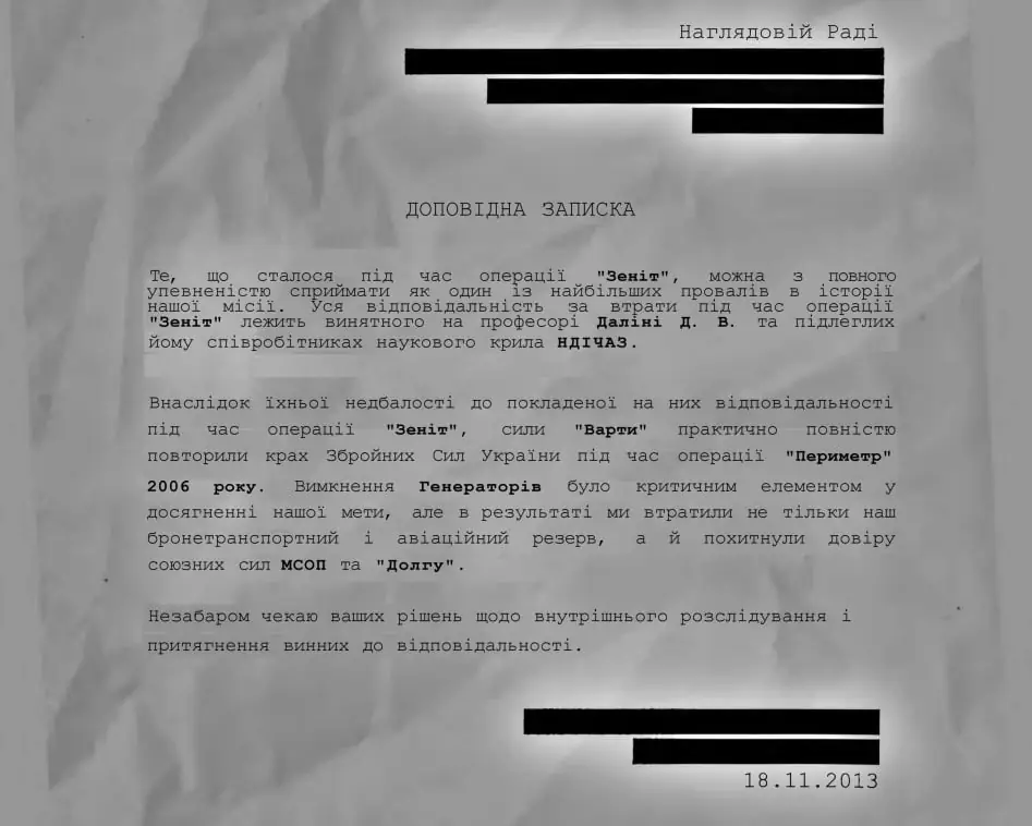 Згідно з українізованими документами, які були частиною ARG, можна дізнатись, що створений НДІЧАЗ, керівником якого є доктор (професор) Далін Д. В., організував в Зоні нову військову операцію, уклавши за посередництвом Варти та особисто її лідера Полковника Коршнова Договір Д4 в 2013 році під кодовою назвою Зеніт.