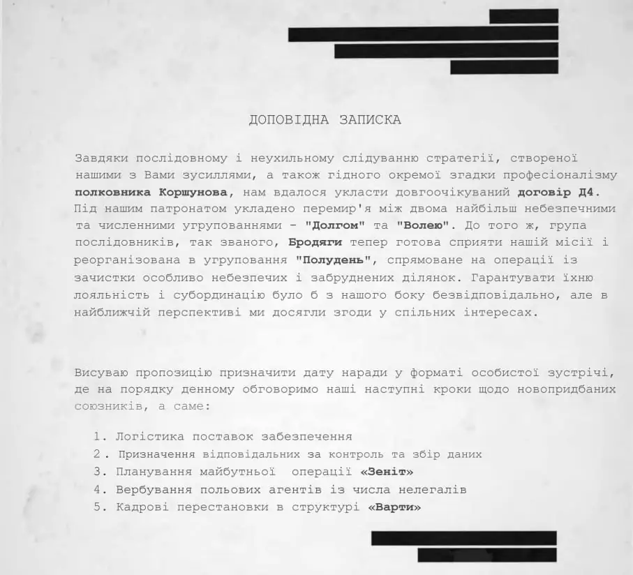 В документі згадується також перша операція в Зоні “Периметр” 2006 р., з якою порівнюють й цю. В Операції брали участь вже давно відомі угруповання “Долг”, “Воля” та “МСОП” (колишні військові), так і нові угруповання: “Варта” з лідером Полковником Коршуновим та новостворене угруповання “Полудень”, на чолі вже з також відомим персонажем – Бродягою для виконання особливо небезпечних завдань на забруднених ділянках і від яких не очікують повної лояльності, адже це колишні члени угруповання “Моноліт”.